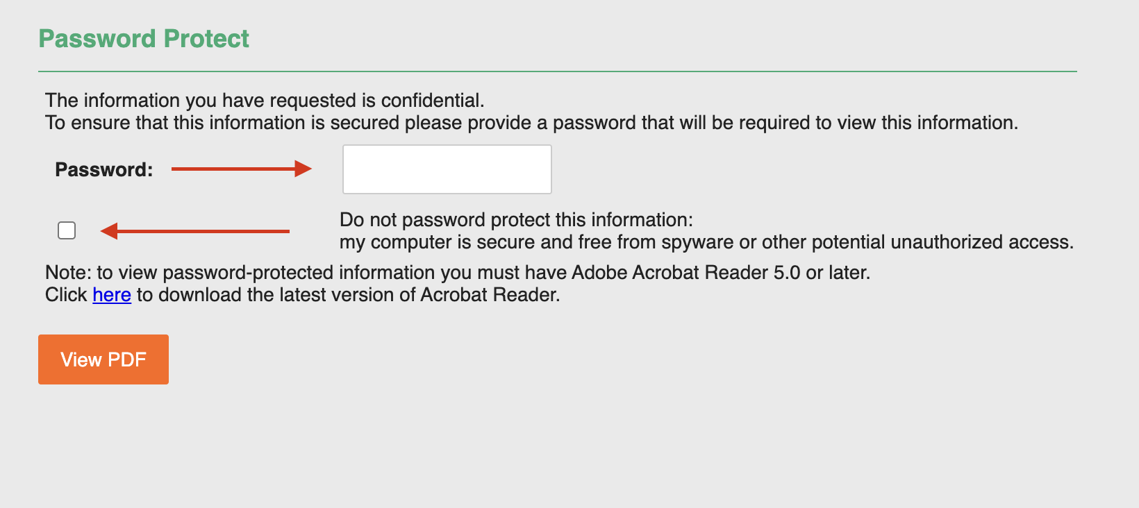 - If you do not want to password-protect your files, click the blank block below and continue by clicking "view PDF."